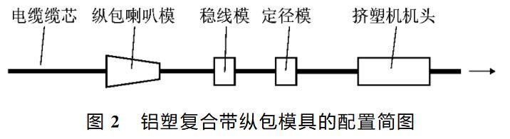 为了防止铝塑复合带纵包时发生断带问题,在制定纵包工艺时必须合理配置模具,保证铝塑复合带在连续运行过程中,逐渐完成变形,模具与铝塑复合带之间产生的摩擦力较小。图2示出了在铝塑复合带纵包过程中的模具配置,所用模具包括纵包喇叭模、稳线模和定径模,铝塑复合带通过这三个模具实现变形。首先铝塑复合带经纵包喇叭模···